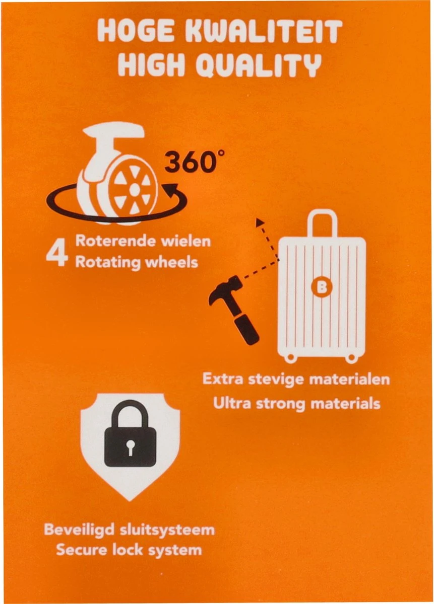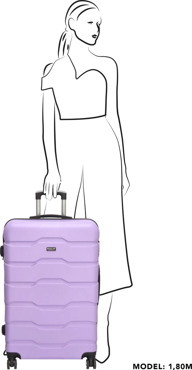 Grote hardschalen, ABS koffer van Beagles Originals. Binnenin gevoerd, voorzien van spanbanden en een tussenschot met rits. Comfortabel door 4-wiel systeem. Op de bovenkant Ên op de zijkant zit een handvat. De koffer is op slot te zetten middels een vast cijferslot op de zijkant van de koffer.