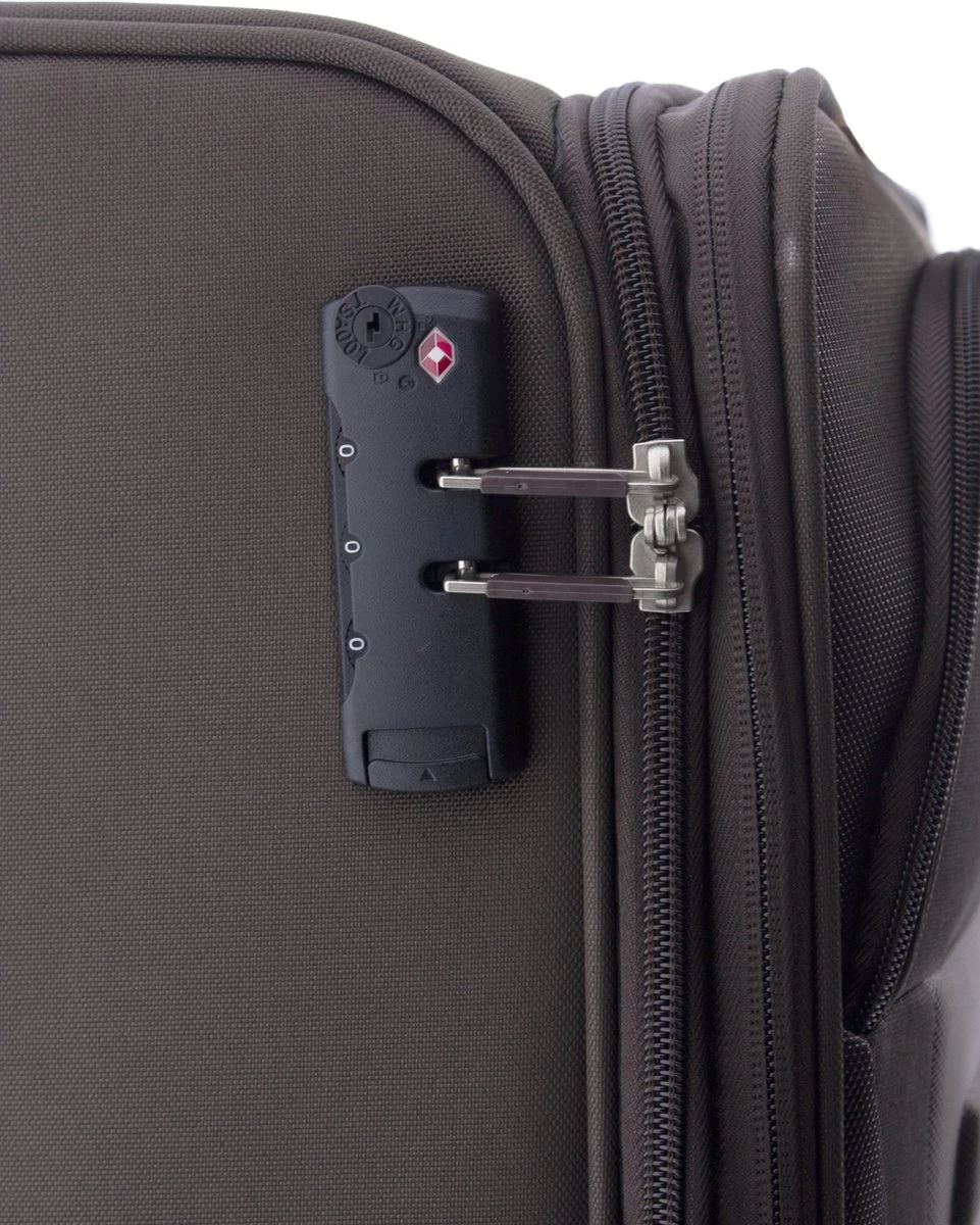 Grote stoffen koffer met dubbele wielen en TSA slot uit de Siroco serie van Gladiator. Koffer is voorzien van een ritssluiting rondom en een extra expandable rits waarmee de koffer qua volume vergroot kan worden van 100 naar 115 liter. Binnenin is de koffer gevoerd, voorzien van elastische spanbanden, een ritsvak en een ritsvak in de binnenkant van de klep. Op de voorzijde van de koffer zitten twee ritsvakken en op de boven- en zijkant zit een handvat. De uitschuifbare trekstang en de 4 zwenkwielen zorgen voor optimaal reiscomfort. De koffer is op slot te zetten middels een vast TSA cijferslot op de zijkant van de koffer.