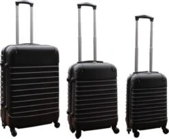 Deze Kofferset is driedelig en bestaat uit maarliefst 3 Koffers. Elke Koffer is zwart van kleur en is o.a. uitgerust met 4 wielen een een uitschuifbare trekstang. Ook zijn alle koffers aan de binnenkant gevoerd en uitgerust met meerdere ritsen (zie foto binnenkant).