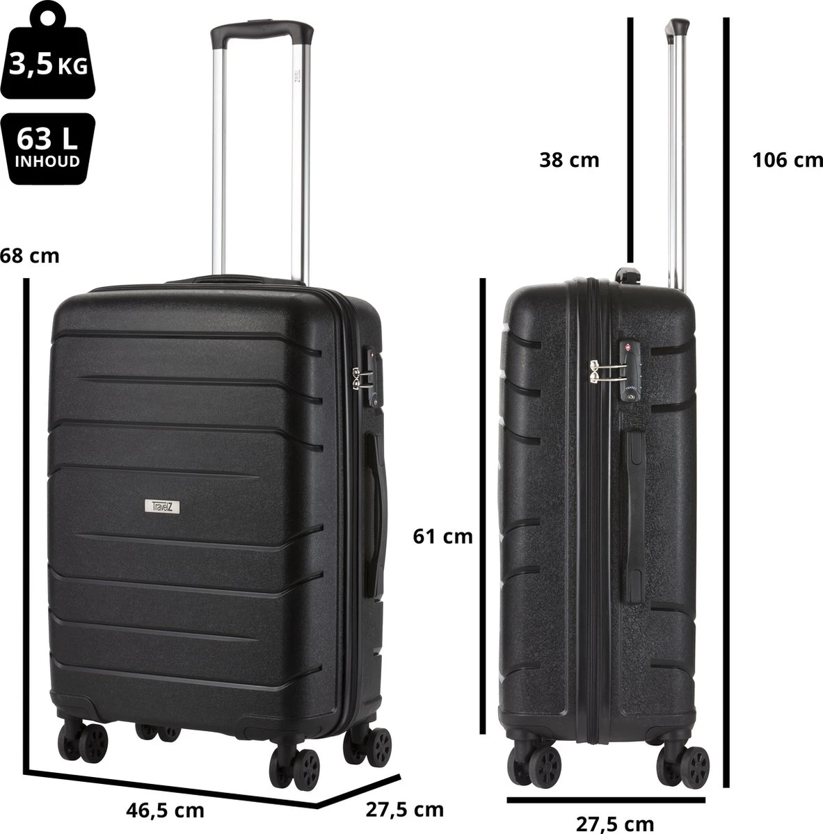 De TravelZ Big Bars is al jaren ÊÊn van de best verkochte koffers van het Nederlandse merk TravelZkoffers. De Big Bars koffers zijn een echte lichtgewicht, erkend met een internationaal TSA-cijfercombinatieslot, soepele trekstang in verschillende standen voor lange en kleine personen, 4 dubbele wielen die volledig rondraaien, een compleet interieur met ritsvak en spanbanden en gemaakt uit ijzersterk polypropyleen. Voordeel van dit materiaaltype is dat het materiaal meeveert en hierdoor bij een enorme impact geen inslag krijgt. Meerdere koffers? Zoek op de TravelZ Big Bars kofferset en pak je prijsvoordeel bij twee of drie koffers. Bekijk kritisch welk formaat koffer je qua afmetingen en literinhoud nodig hebt voor de reis. Afmeting is incl wielen.